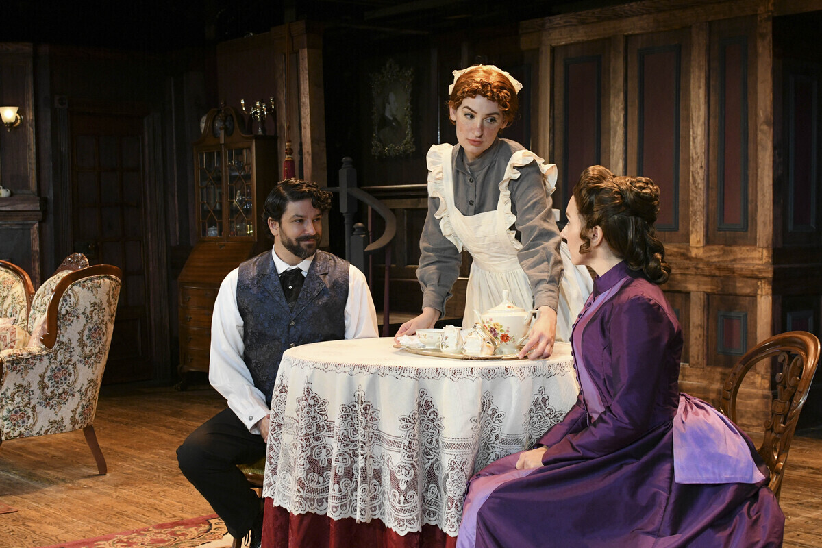 The Manninghams’ two servants appear throughout the story, having seen and overheard it all as only servants can. Katherine S. Wright shines as the impudent but impressionable young Nancy, and Debra Wagoner is outstanding as Elizabeth, whose fear is palpable in moments when she alone can keep her employer safely in the dark.